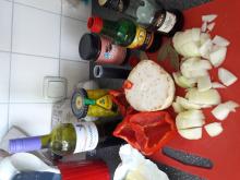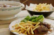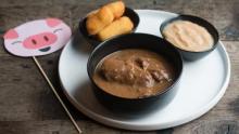 Stoverij van varkenswangen met krieken en groentefrietjes. Naar de slager dus voor deze Oosterse varkenswangen.